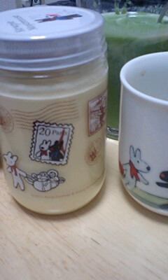 でもって奥の緑色の気味の悪い物体は、青汁ヨーグルト豆乳です。